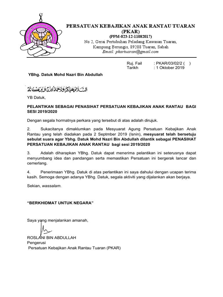 Contoh Surat Pelantikan Penasihat Persatuan